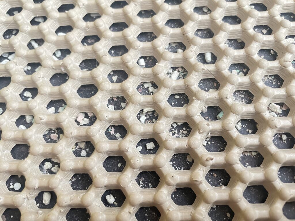 網から下の部分まで浸透してしまい、下にある砂にくっ付いてしまうと、マットを縦にしても砂がサラサラと落ちてこないからです。