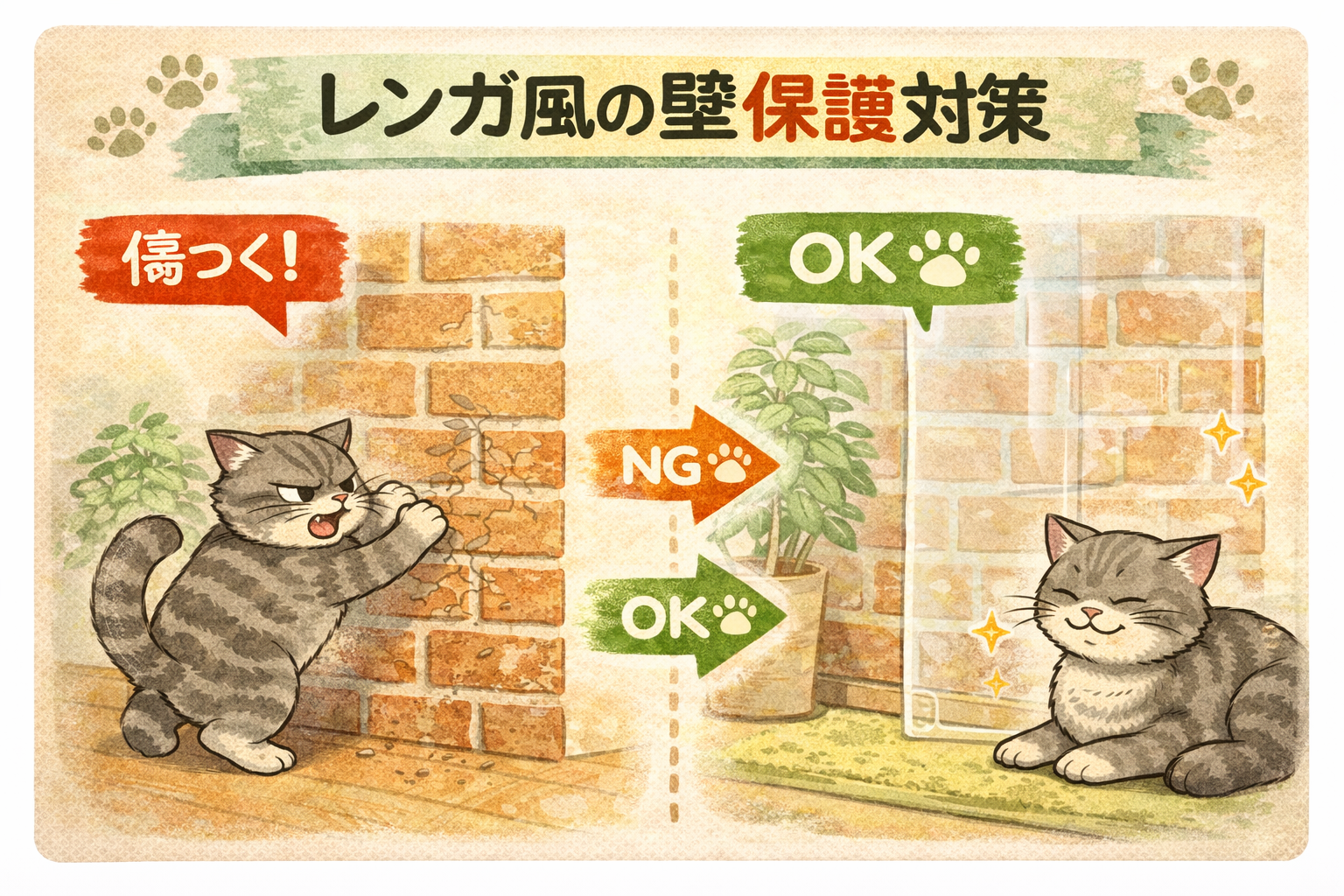 【猫の爪とぎ対策・Part.2】腰壁を越えた4にゃん…!高い壁は『レンガ』で死守せよ!」