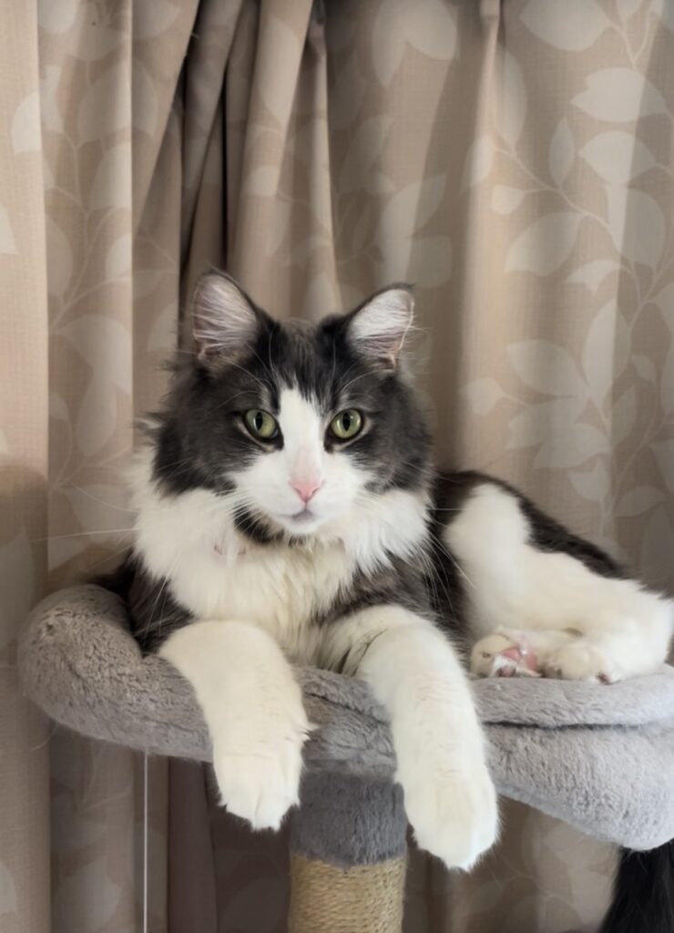 ラガマフィンらしくおっとり……と思いきや、彼女はとにかく高い所が大好き。ふと視線を感じると、キャットタワーの最上段から、静かにこちらを監視しています(笑)。呼んでも来ないツンデレっぷりも魅力です。