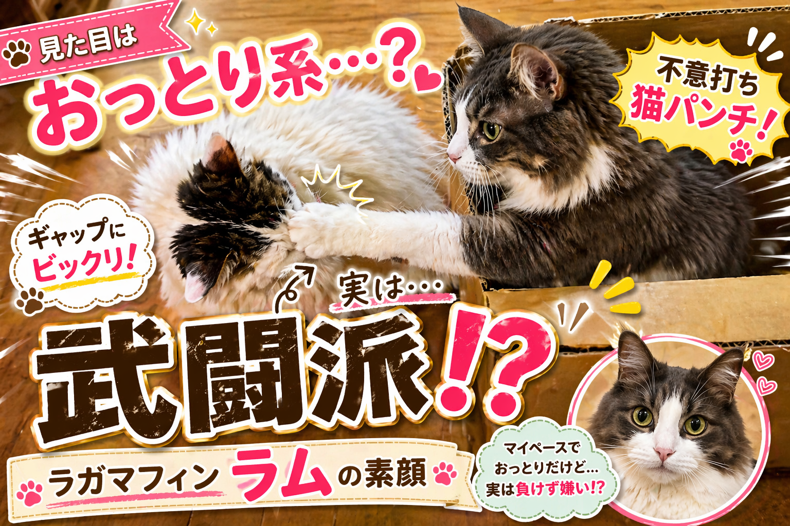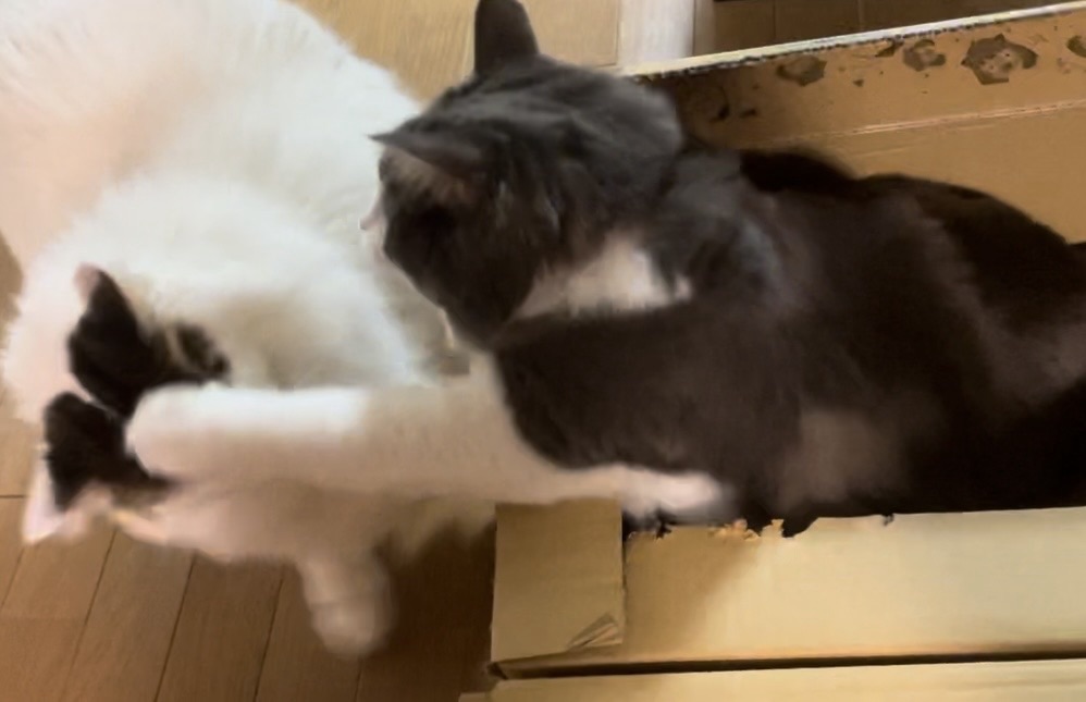 この写真は、フータが通りかかった瞬間、段ボールの中から不意打ちの音速パンチ(猫パンチ)を見舞った決定的瞬間です!